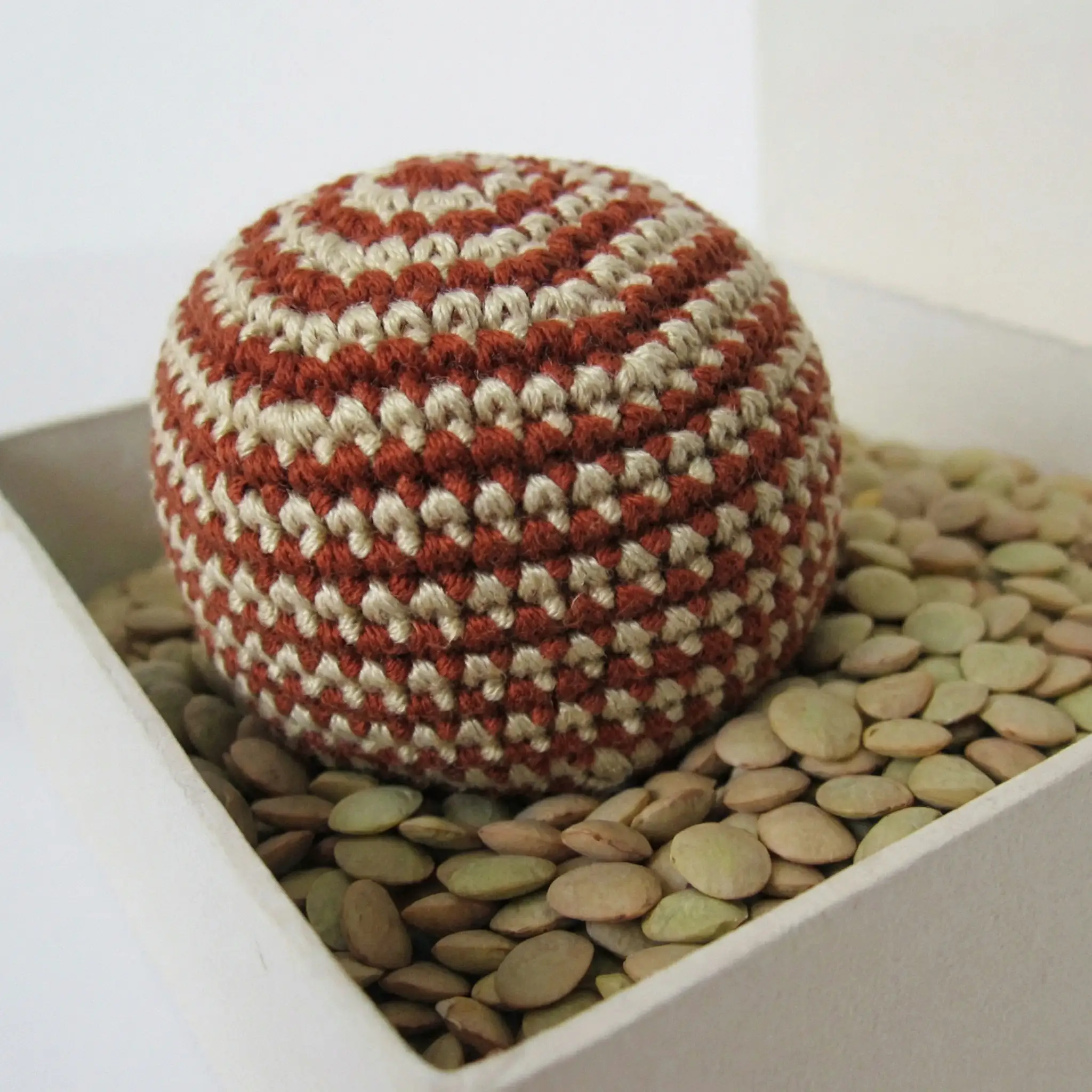 Taille finale d’un footbag standard, variable selon le fil, le crochet et le type de remplissage utilisé.